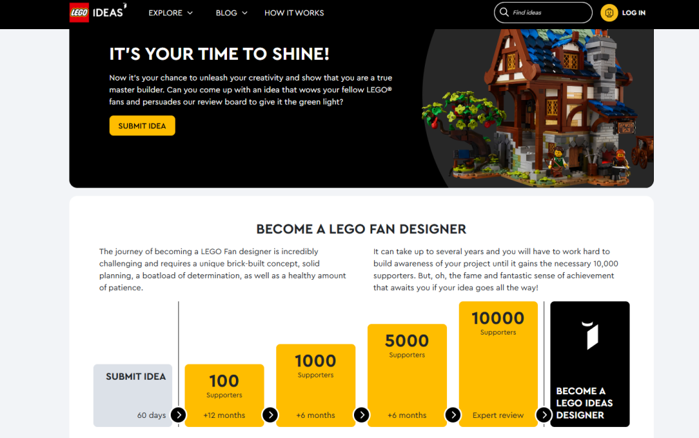 樂(lè)高通過(guò)“樂(lè)高創(chuàng)意”(LEGO IDEAS)這一在線創(chuàng)意平臺(tái),為全球樂(lè)高愛(ài)好者提供了展示自己作品的機(jī)會(huì)。在線上創(chuàng)意社區(qū)這一開(kāi)放互動(dòng)平臺(tái)中,用戶可以提交各種創(chuàng)意作品,獲得高投票的優(yōu)秀作品可成為樂(lè)高的正式產(chǎn)品。此時(shí),品牌與用戶之間不再是傳統(tǒng)的買賣關(guān)系,而是合作共創(chuàng)的伙伴。