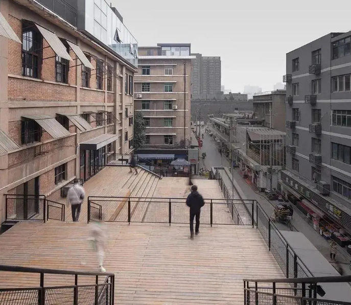 作為發(fā)起點(diǎn),現(xiàn)有菜場(chǎng)部分被完全保留。項(xiàng)目最核心的“修補(bǔ)”有三處:連接市場(chǎng)入口與1、2號(hào)樓的臺(tái)階廣場(chǎng),連接地面層與2號(hào)樓屋頂?shù)慕煌ㄍ玻约斑B接2號(hào)樓屋頂和3號(hào)樓的連橋。開敞的臺(tái)階廣場(chǎng)層層上行,不僅引導(dǎo)人流進(jìn)入上層空間,還成為了菜場(chǎng)公共生活的舞臺(tái)。同時(shí),廢舊廠房改造成了如今免費(fèi)開放的藝術(shù)展區(qū),這里不定期會(huì)舉辦各式不同主題的展覽活動(dòng),已經(jīng)成為新晉網(wǎng)紅打卡盛地。