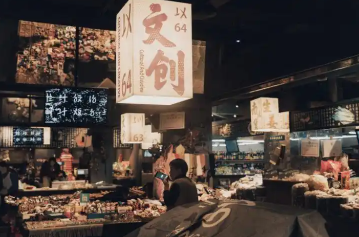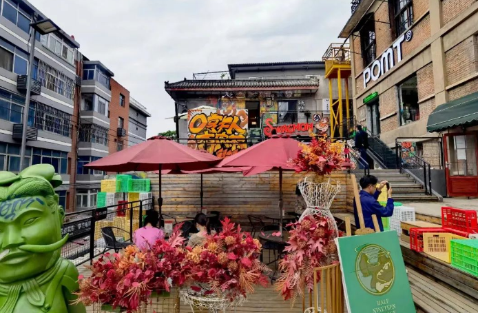 其中,信義巷子主要匯集特色小鋪,一樓布滿如陜西特產(chǎn)、小磨香油、新鮮肉鋪等門面,二樓則由咖啡館、美甲店等小店組成。每家店鋪頂部都有懸掛老菜場(chǎng)統(tǒng)一設(shè)計(jì)的小旗幟,既和諧統(tǒng)一又各含特色;有戲主題板塊主要以脫口秀,劇本殺,婚禮,攝影及文創(chuàng)手工等工作室等業(yè)態(tài)為主,以“有戲”為名也代表著希望,象征著新銳市井文化的希望;悅夜板塊,主要匯集酒吧、民宿等多種休閑元素。尋味板塊,則提供少燒烤、韓料、特色小吃等餐飲。