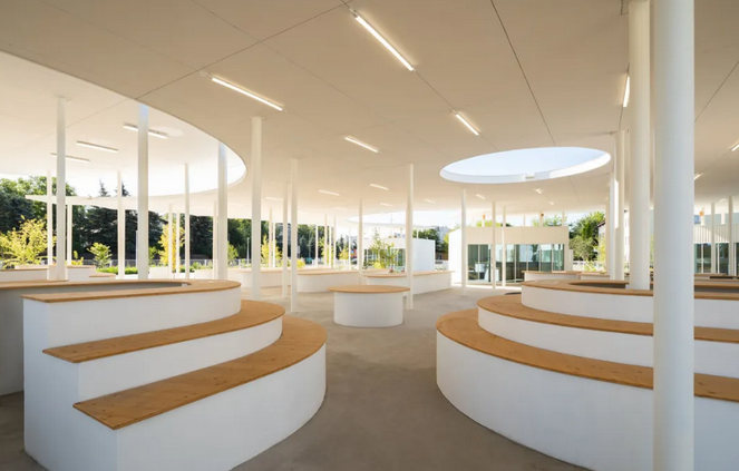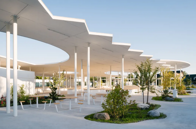此外,廣場(chǎng)光滑的混凝土面層沒有路緣石,無論是步行、坐輪椅還是滑滑板都可以在市場(chǎng)上安全自由地移動(dòng),方便了不同人群的使用,體現(xiàn)了設(shè)計(jì)的人性化和包容性;各種街道固定裝置如白色的圓形信息板、自行車架、巨石、鳥類和昆蟲屋及社區(qū)共用桌椅等點(diǎn)綴其中。在極具特色的有機(jī)屋頂下,還設(shè)有帶木雕動(dòng)物造型搖椅的游樂花園,為集市增添了藝術(shù)氛圍和趣味性。